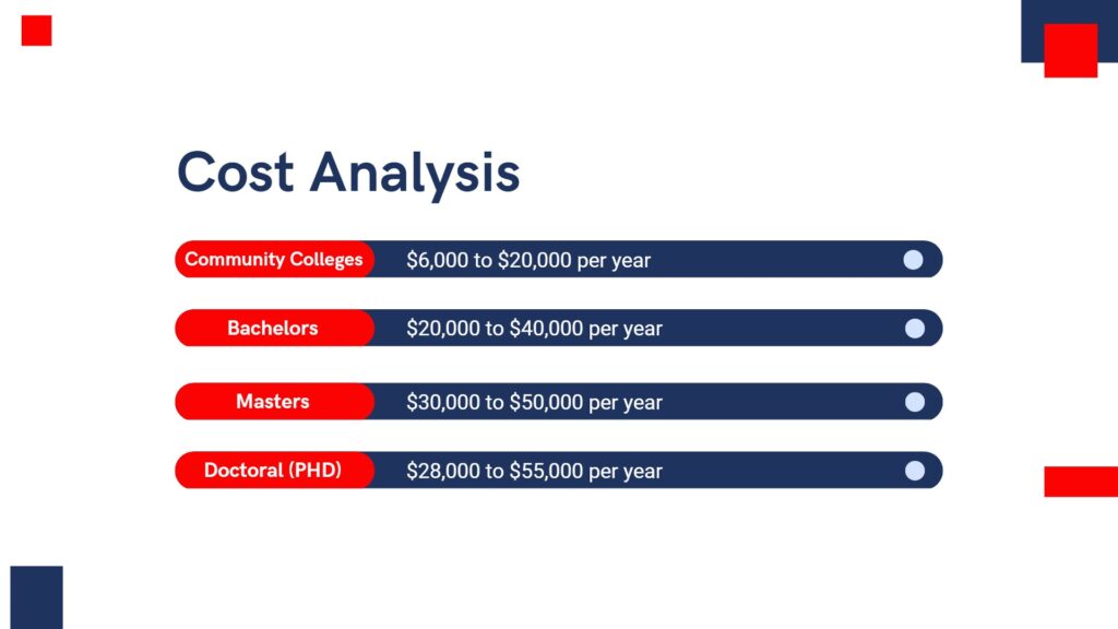 Public/State and Private universities make up the majority of the university population in the United States. A public or state university has cheaper tuition than a private college or university. Your tuition costs will vary depending on the degree program and university or school you choose. You will require between $8,000 and $55,000 (USD) per year to pay for tuition. Most commonly, humanities, arts and education courses are cheaper, while subjects such as medicine and engineering are likely to be more expensive. If you wish to study at postgraduate level, the tuition fees are typically higher and the costs vary depending on the program. As with most other countries, MBA programs are often the most expensive. The average cost for these programs is approx. $35,000 yearly (indicative).